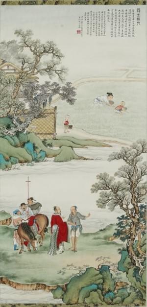 Scène animée près d'un plan d'eau, aquarelle et encre sur papier...
