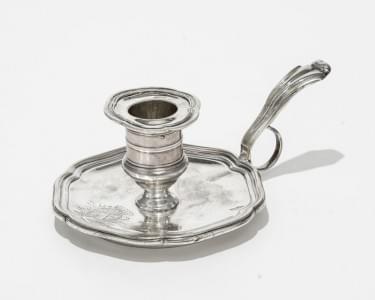 375. Bougeoir à main à bordure festonnée et gravé d'armoiries comtale...
