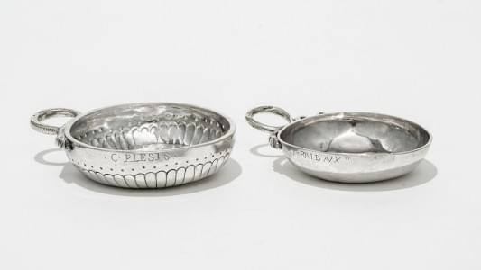 389. Deux taste-vin à prise gravée d'Amour tenant un arc et une torch...