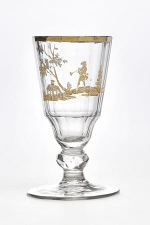 401. Verre sur pied facetté à motif doré de pâtre musicien