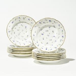 405. 12 assiettes à dessert à motif de semis de bleuets et bordure do...