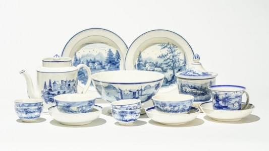 408. Service à thé à décor blanc bleu de maisons et paysages