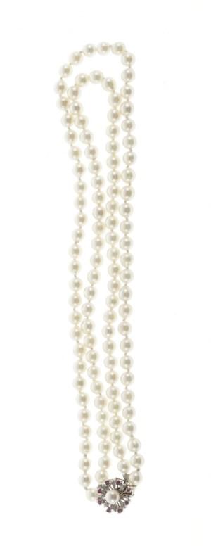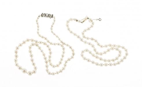 3021. Lot de deux colliers de perles, l'un agrémenté d'un fermoir sert...