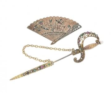 3038. Broche épée sertie de diamants en rose, rubis et émeraudes