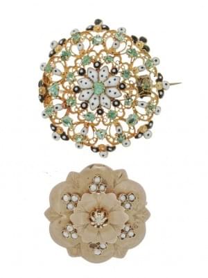 3058. Lot de deux broches fleur, l'une émaillée et sertie d'émeraudes,...