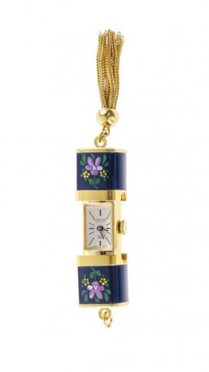 3066. Heno, montre pendentif à quartz à décor floral laqué polychrome...