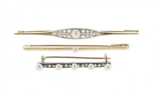 3078. Lot de trois broches barrette serties de perles et roses de diam...