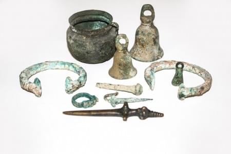 3407. Ensemble de vase, bracelets, cloches et divers, probablement Lur...