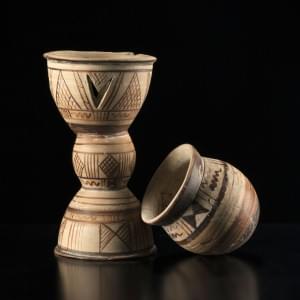 Terre cuite à motifs géométriques, H 10 et 19 cm. Provenance: co...