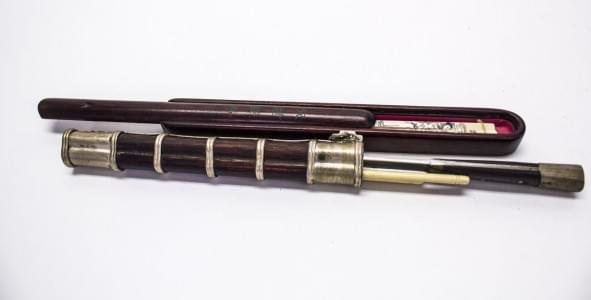 Bois et métal argenté à décor gravé d'oiseaux, L 6.5, 11 et 14,5...