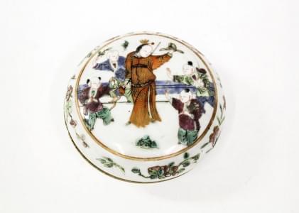 Porcelaine à décor polychrome de personnages et enfants, D 9 cm