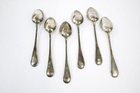 3655. 6 cuillères à thé à motif ruban croisé et gravées d'un arbre hér...