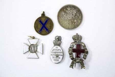 3657. Rouble de 1897, 3 médailles et 1 broche de la croix rouge russe