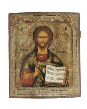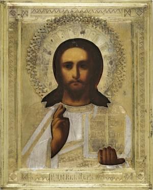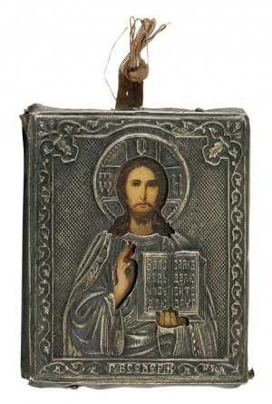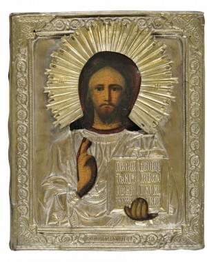 Icône russe, tempera sur panneau, oklade en métal argenté, XIXe...