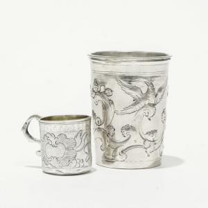 3668. Une timbale et une charka à anse à décor de volutes et oiseau