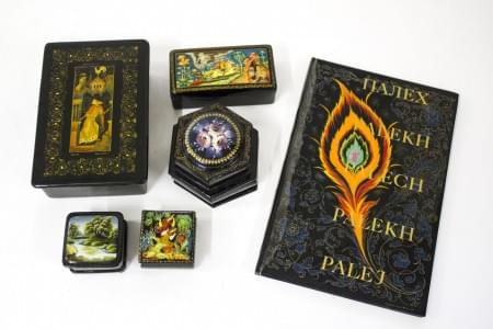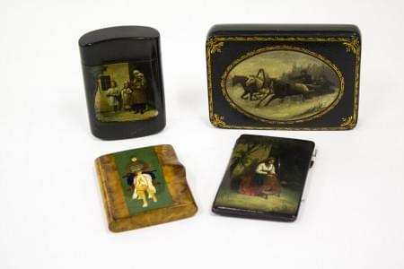 3675. Cinq boîtes à décor de scènes historiques et populaires russes