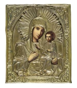 Icône russe, tempera sur panneau, oklade en métal doré, XIXe s,...