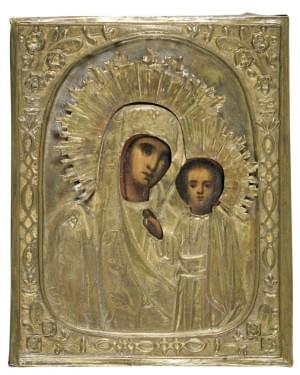 Icône russe, tempera sur panneau, oklade en laiton, XIXe s, 17,5...