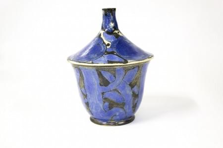 Pot couvert, céramique émaillée beige, bleu et noir, signé, H 19...