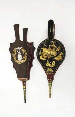 L'un bois laqué noir et or, l'autre incursté d'ivoire et laiton,...