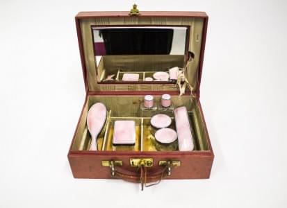 3835. Nécessaire de toilette guilloché et émaillé rose et verre gravé...
