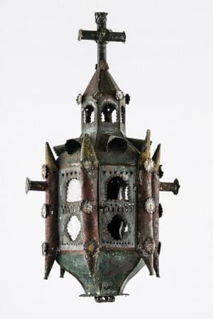 Tôle peinte, découpée et ajourée, sumontée d'une croix, H 64 cm....