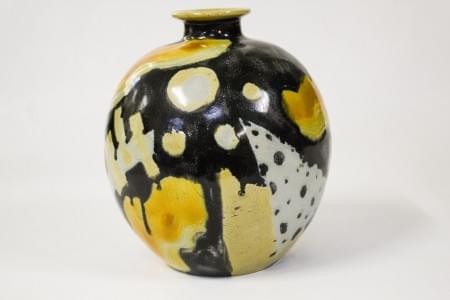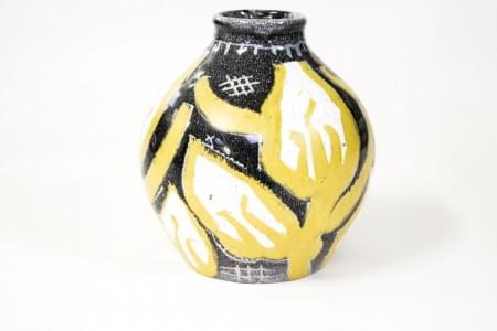 Vase boule, céramique émaillée jaune, blanc, noir, signé, H 17,5...