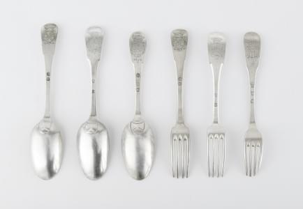 479. Suite de 6 fourchettes et 6 cuillères aux armes de la famille pa...