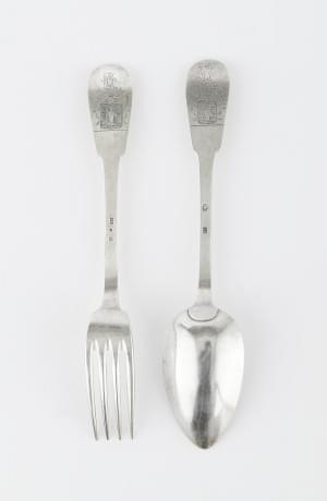 474. Suite de 11 fourchettes et 12 cuillères gravées aux armes Techte...