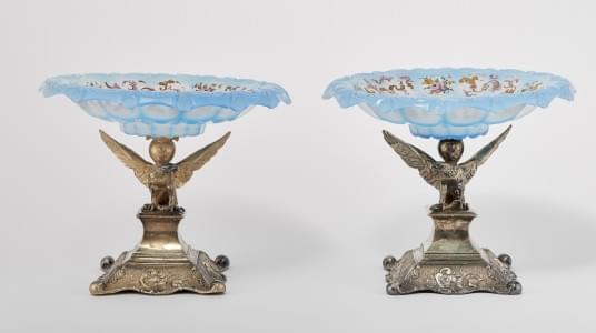 Bohème, XIXe s, opaline blanche, overlay bleu ciel, émaux polych...