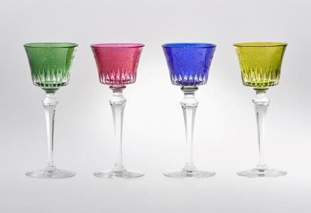519. Suite de 12 verres à vin colorés à décor gravés de paons dans de...