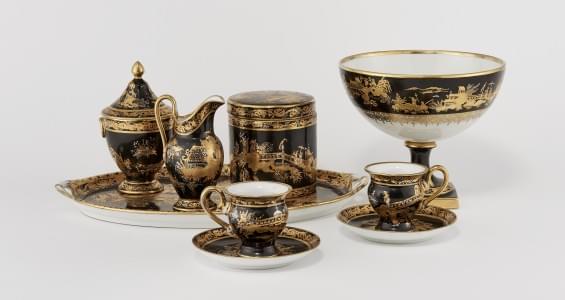 527. Service tête-à-tête à motif aux Chinois or sur fond noir