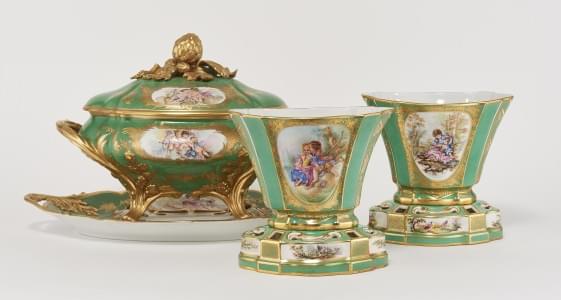 530. Grande soupière de style Louis XV et paire de vases sur piédouch...