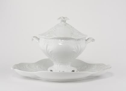 532. Grande soupière ovale sur présentoir sommée d'un fretel artichau...