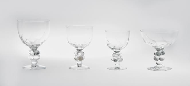 comprenant: 2 carafes, six tailles de verres sur pied, 12 coupes...