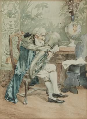Homme jouant du tuba, aquarelle sur papier, signée, 33x24 cm