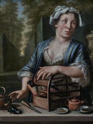 Portrait d'une femme avec oiseau, huile sur panneau, monogrammée...