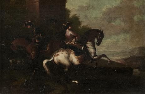 La halte des cavaliers, paire d'huiles sur toile, 20x30 cm
