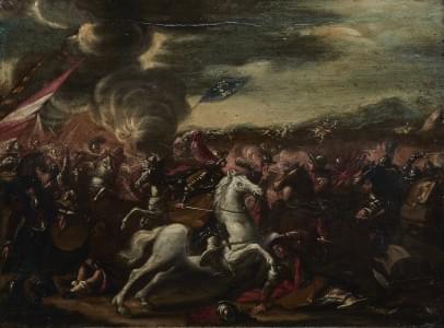 Deux scènes de batailles, paire d'huiles sur panneaux, 40x55 cm