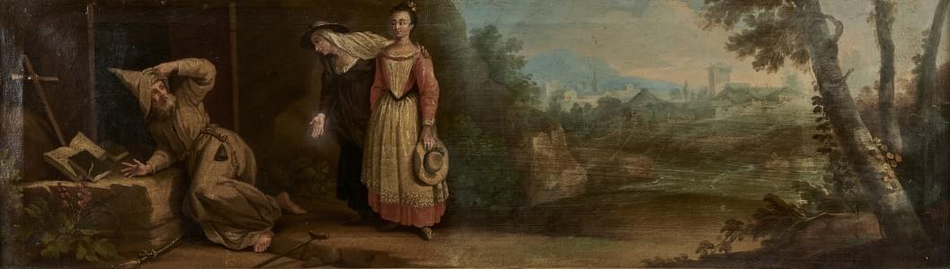 Saint Ermite dérangé par deux femmes, huile sur toile, 33x112 cm