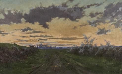 Chemin de campagne au crépuscule, huile sur toile, signée, 40x66...