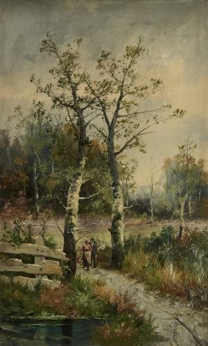 Chemin animé, huile sur toile, signée Lessing, 69x41 cm