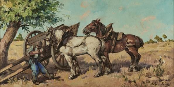 Repos de l'ouvrier agricole, huile sur panneau, signée A.G. Sola...
