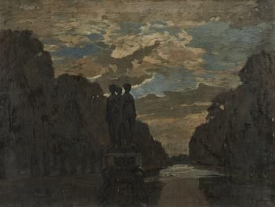 Statue des trois grâces dans le parc au crépuscule, huile sur to...