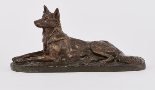 Chien de berger couché, bronze à patine brune, signé, L 37 cm