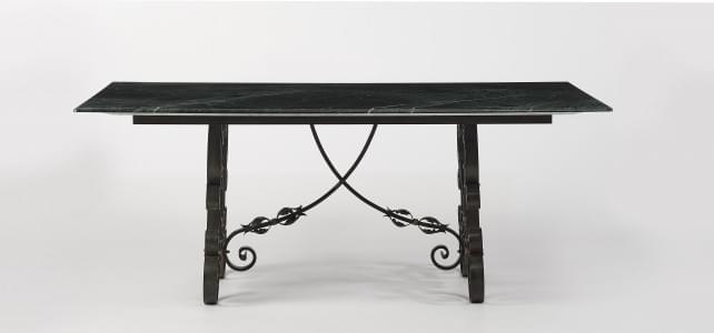 Piètement en fer forgé, plateau de marbre vert, 77x195x114 cm