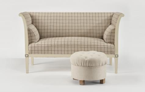 Bois laqué beige, tissu beige à carreaux, L 156 cm. On joint un...
