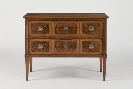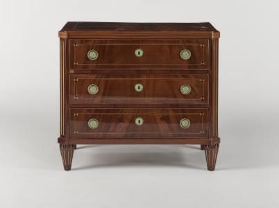 Trois tiroirs, acajou et bois fruitier marqueté en filets, métal...