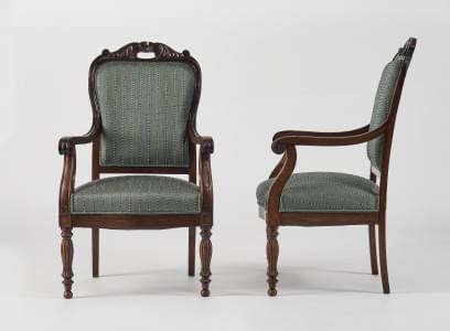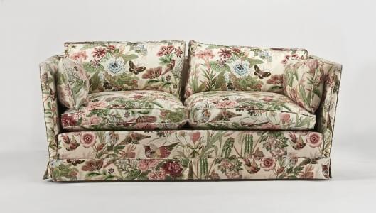 Dossier à chapeau de gendarme, hêtre, tissu à fleurs indiennes