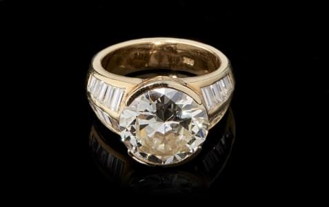 746. Bague sertie d'un diamant (env. 6 ct) épaulé d'un pavage de diam...